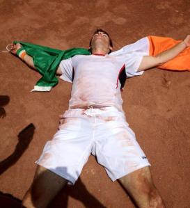 I had won the match to seal the Tie and helped Ireland stay in Group 2, it was a fantastic moment and completely euphoric for those few seconds. The picture below was taken of me minutes after I won the match and I even remember saying a few Hail Mary’s with the flag wrapped around me. Never in my life had I felt so exhausted, relieved and grateful at the same time. It was an AWESOME experience and one I will never forget.