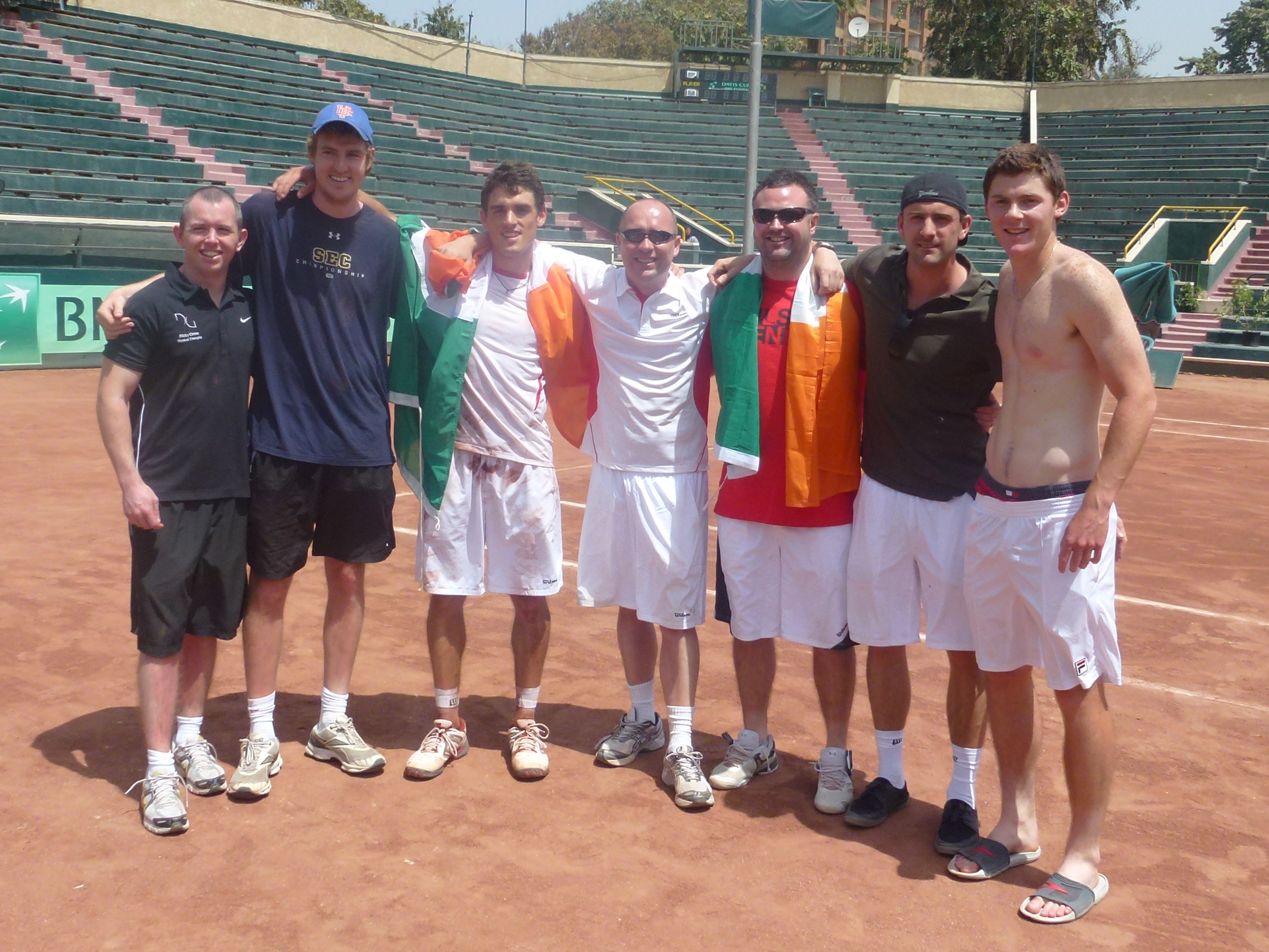I had won a $10,000 Futures Singles and Doubles title ( w/Sam Barry) in Bahrain the week before the Tie so Sam and I flew from Bahrain to Cairo on the Sunday morning. The rest of the Irish Team flew from London. The team consisted of myself, Conor Niland, Sam Barry, James Cluskey and fifth man Daniel Glancy. Garry Cahill was team captain with Johnny McCormick as assistant coach and Nicky Greene as physical therapist.